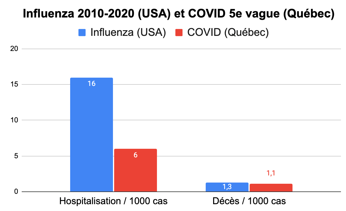 « si on fait la moyenne de ces données, on en arrive aux chiffres suivants : le taux de mortalité de la grippe était durant ces 10 ans de 0,13 % ou encore 1,3 personne sur 1000 infectés. Ce qui est… un peu plus élevé à celui de la COVID à 1,1. »